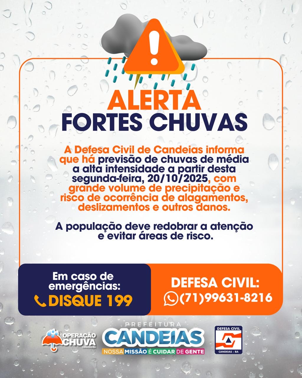 A Defesa Civil pede que a população redobre a atenção e evite áreas de risco. Para qualquer emergência, ligar para 199 ou 71-99631-8216.