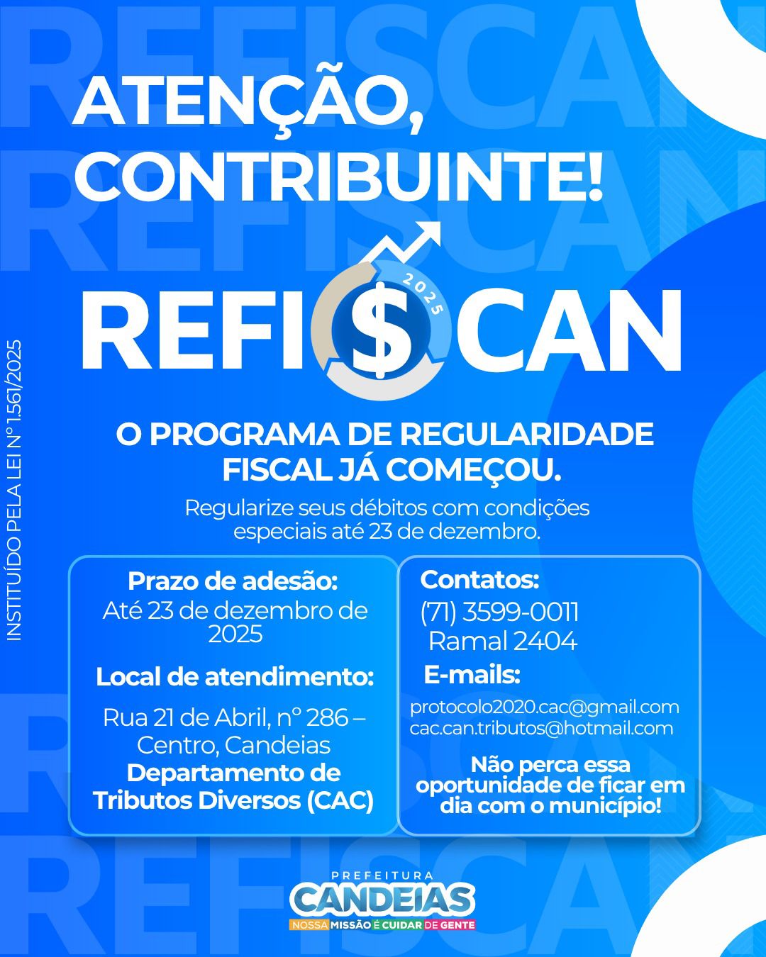 Os contribuintes de Candeias que possuem débitos tributários e desejam regularizar sua situação junto ao município têm até o dia 23 de dezembro para aderir ao Programa de Regularidade Fiscal (PRF), antigo Refiscan.