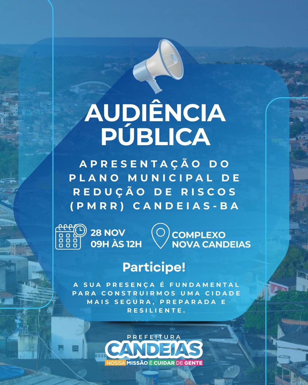 A Prefeitura de Candeias está convocando a população para apresentar nesta sexta-feira (28), a partir de 9h, durante audiência pública no auditório do Complexo da Nova Candeias, o Plano Municipal de Redução de Riscos (PMRR). O documento foi elaborado por meio do Projeto Periferia Viva, do Ministério das Cidades, em parceria com a Universidade Federal da Bahia (UFBA).