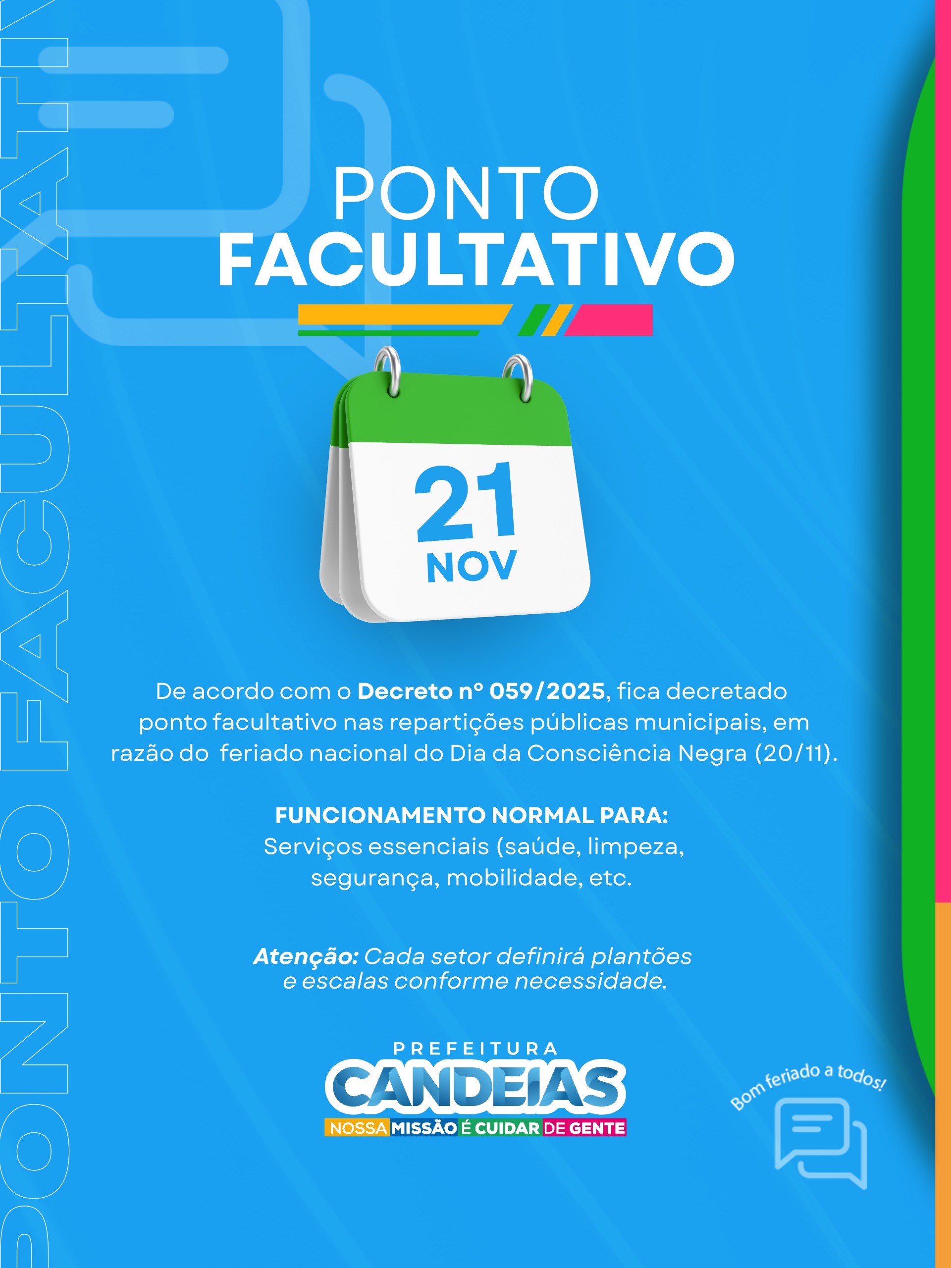 Em celebração ao Dia da Consciência Negra, comemorado nacionalmente no dia 20 de novembro, a Prefeitura de Candeias decretou ponto facultativo nas repartições públicas na sexta-feira, 21.