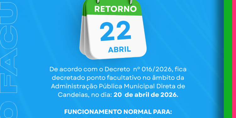 Os servidores públicos de Candeias terão ponto facultativo na próxima segunda-feira (20), véspera do feriado nacional de Tiradentes, celebrado em 21 de abril.